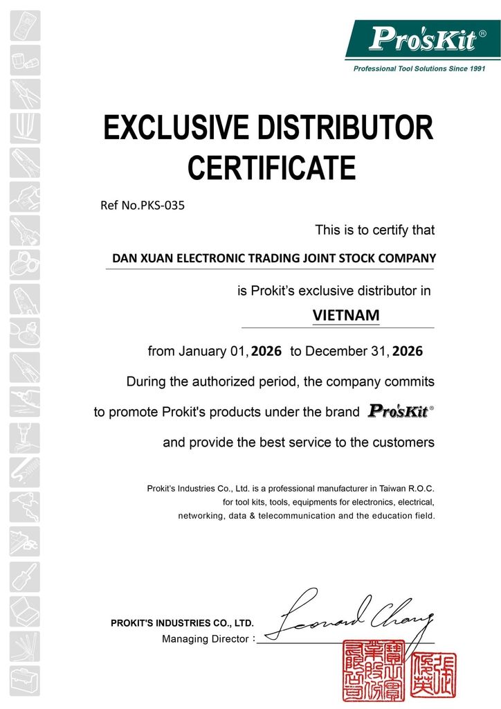 Chứng nhận độc quyền cho phép Điện tử Dân Xuân phân phối các dòng sản phẩm của Pro’skit, một trong những thương hiệu dụng cụ và thiết bị kỹ thuật hàng đầu tại thị trường Việt Nam.
