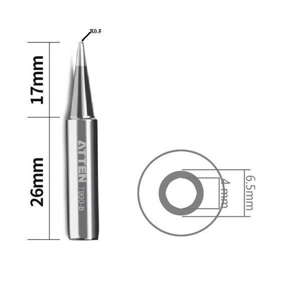 Mũi hàn Atten T900-B là loại mũi chóp nhọn (conical tip), với đường kính đầu hàn 0.5 mm—lý tưởng cho các thao tác hàn đòi hỏi độ chính xác như các chân linh kiện nhỏ, kết nối SMD hoặc các mối hàn vi mạch