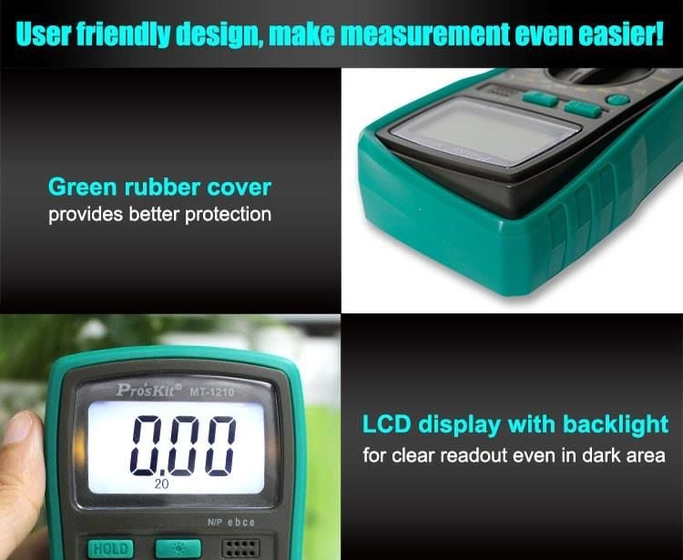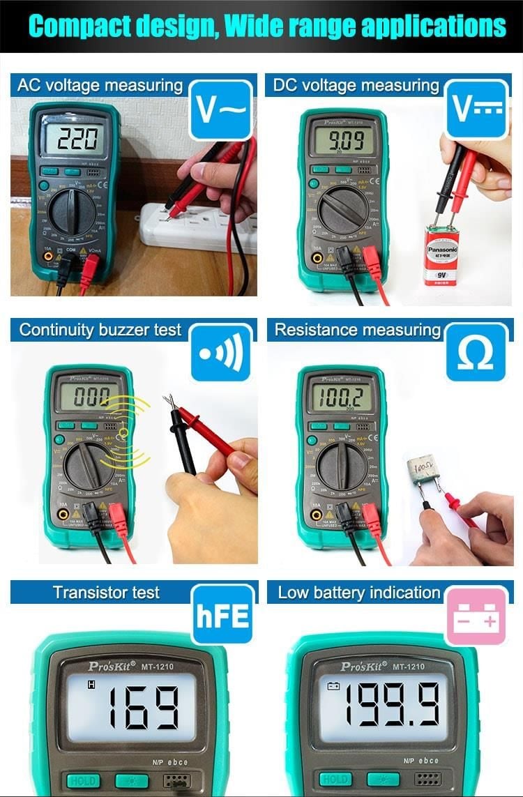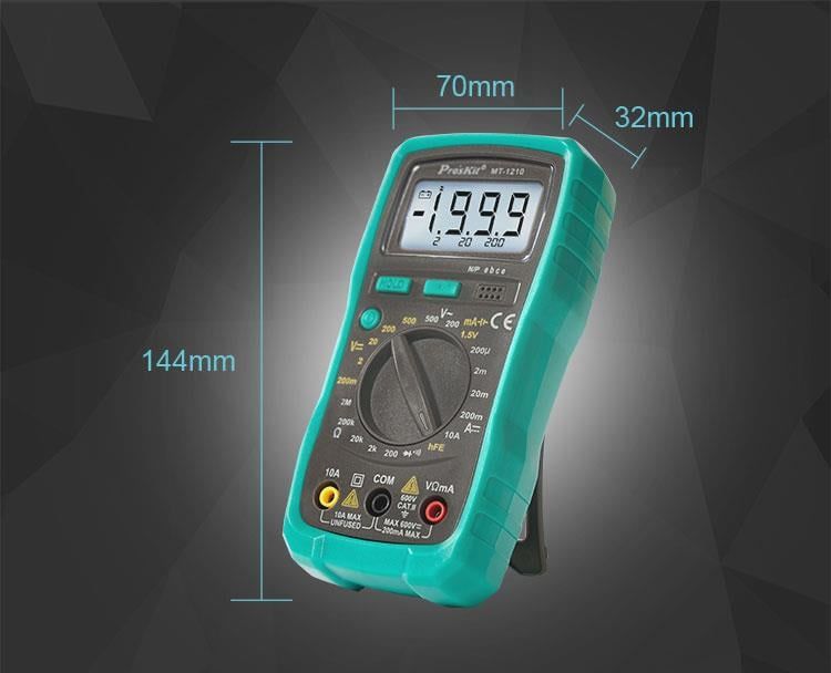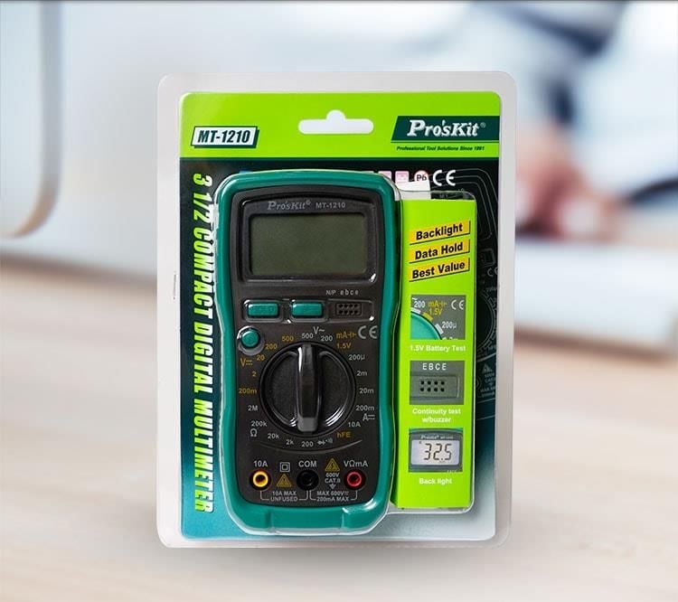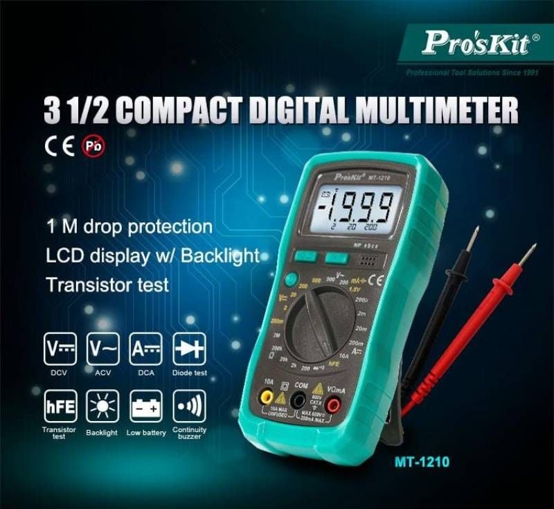 Pro'sKit MT-1210 là đồng hồ vạn năng kỹ thuật số nhỏ gọn, lý tưởng cho sinh viên, kỹ thuật viên và người dùng DIY. Thiết bị hỗ trợ đo điện áp AC/DC, dòng điện DC, điện trở, kiểm tra diode, transistor (hFE), liên tục (có còi) và pin 1.5V. Màn hình LCD 3½ số (1999 counts) với đèn nền giúp đọc kết quả dễ dàng trong điều kiện ánh sáng yếu. Thiết kế thân thiện, dễ sử dụng và phù hợp với nhiều ứng dụng điện tử cơ bản.