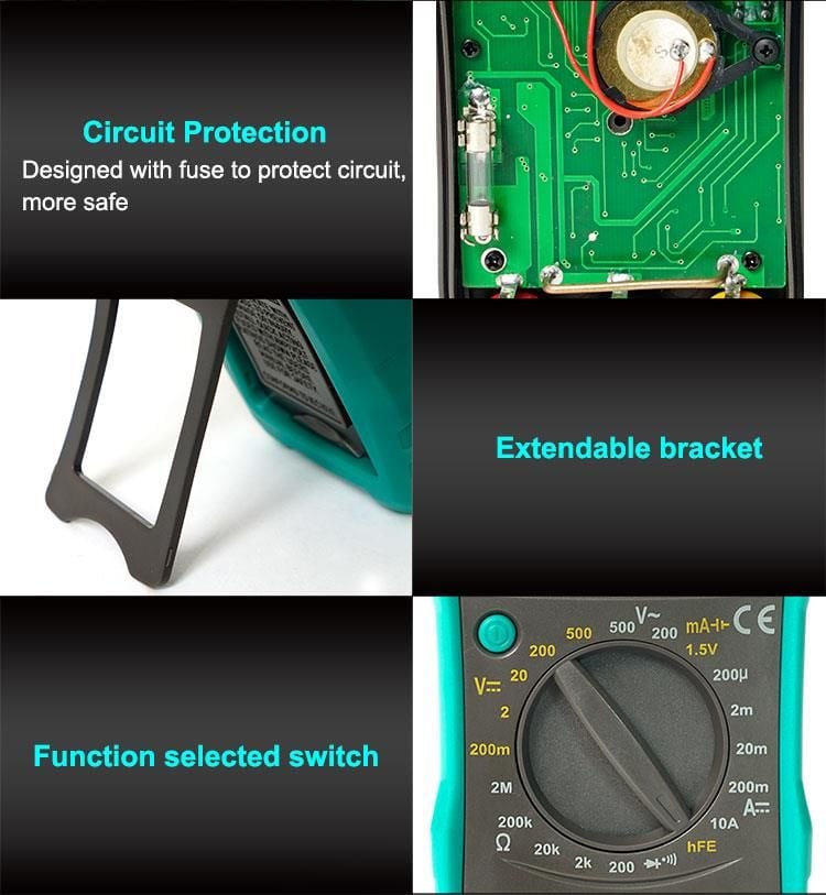 Chuẩn bị: Lắp pin 9V vào ngăn chứa pin phía sau thiết bị. Kết nối dây đo vào các cổng tương ứng trên đồng hồ. Đo điện áp (AC/DC): Chọn thang đo phù hợp bằng cách xoay núm vặn. Kết nối que đo đỏ vào cổng VΩmA và que đo đen vào cổng COM. Đặt que đo vào hai điểm cần đo và đọc kết quả trên màn hình. Đo dòng điện DC: Chọn thang đo dòng điện phù hợp. Kết nối que đo đỏ vào cổng 10A (nếu đo dòng lớn) hoặc VΩmA (nếu đo dòng nhỏ), que đo đen vào cổng COM. Đặt que đo vào mạch và đọc kết quả. Đo điện trở: Chọn thang đo điện trở phù hợp. Kết nối que đo vào hai đầu của điện trở và đọc giá trị trên màn hình. Kiểm tra diode và liên tục: Chọn chức năng diode hoặc liên tục. Kết nối que đo vào hai đầu của diode hoặc mạch cần kiểm tra. Đọc kết quả trên màn hình hoặc nghe tiếng còi (nếu có liên tục). Kiểm tra transistor hFE: Chuyển sang chế độ hFE. Cắm chân transistor vào khe cắm tương ứng (NPN hoặc PNP). Đọc giá trị hFE trên màn hình. Sử dụng đèn nền và giữ dữ liệu: Nhấn nút đèn nền để bật/tắt ánh sáng màn hình. Nhấn nút "Hold" để giữ giá trị hiện tại trên màn hình. Bảo quản: Sau khi sử dụng, tắt thiết bị và tháo pin nếu không sử dụng trong thời gian dài. Bảo quản thiết bị ở nơi khô ráo, tránh nhiệt độ và độ ẩm cao.