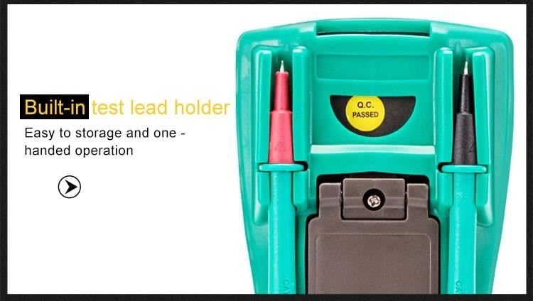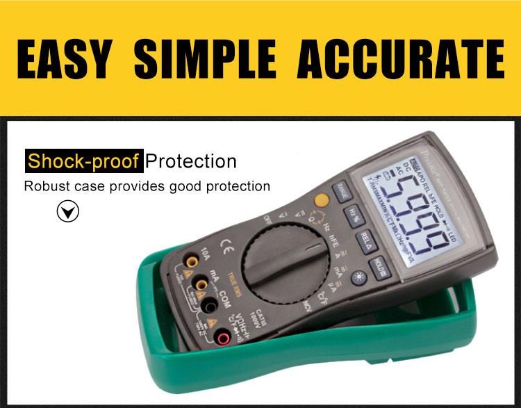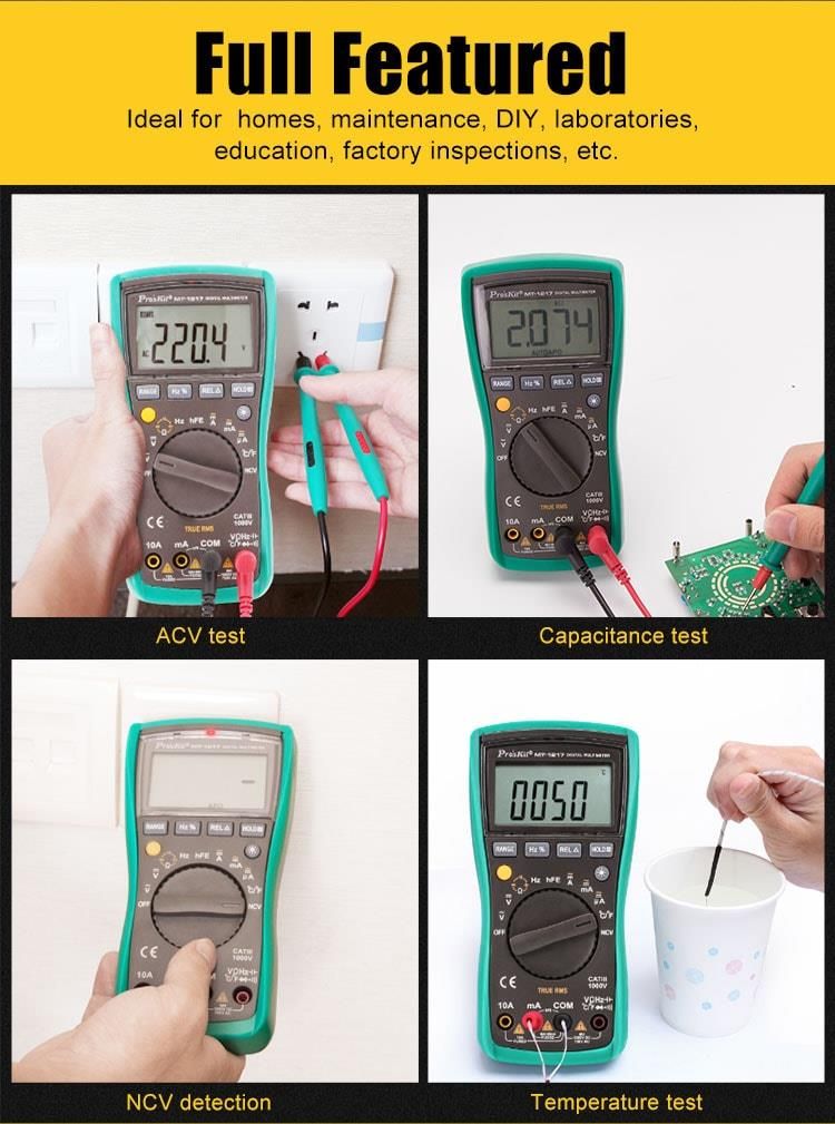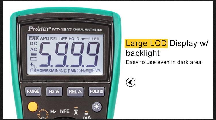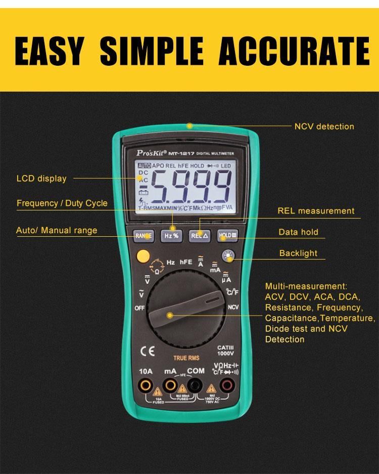 Pro'sKit MT-1217 là đồng hồ vạn năng kỹ thuật số 3 5/6 số (5999 counts) với khả năng đo True RMS, phù hợp cho các công việc kiểm tra và sửa chữa điện tử, điện dân dụng và công nghiệp. Thiết bị hỗ trợ đo điện áp, dòng điện AC/DC, điện trở, tụ điện, tần số, nhiệt độ, kiểm tra diode, transistor, và phát hiện điện áp không tiếp xúc (NCV). Màn hình LCD lớn 20mm với đèn nền giúp dễ dàng quan sát trong điều kiện ánh sáng yếu. Tính năng tự động tắt nguồn, giữ dữ liệu, đo tương đối và cảnh báo pin yếu mang lại sự tiện lợi và tiết kiệm năng lượng.