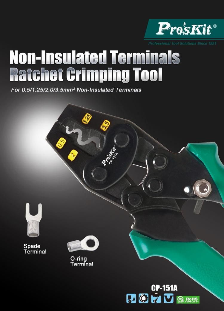 Pro’sKit CP‑151A là kìm ép đầu cos trần (Y.O type) mini tích hợp cơ chế ratchet tiết kiệm lực, hỗ trợ ép chính xác đầu cos không cách điện với tiết diện 0,5–3,5 mm². Thân bằng thép carbon S45C phủ oxit đen chống gỉ, đầu ép (die set) bằng hợp kim AISI 4140 đạt độ cứng HRC 40–42°, giúp đảm bảo độ bền và chính xác qua nhiều lần sử dụng. Tay cầm TPR chống trượt, thiết kế công thái học với lỗ móc tiện bảo quản