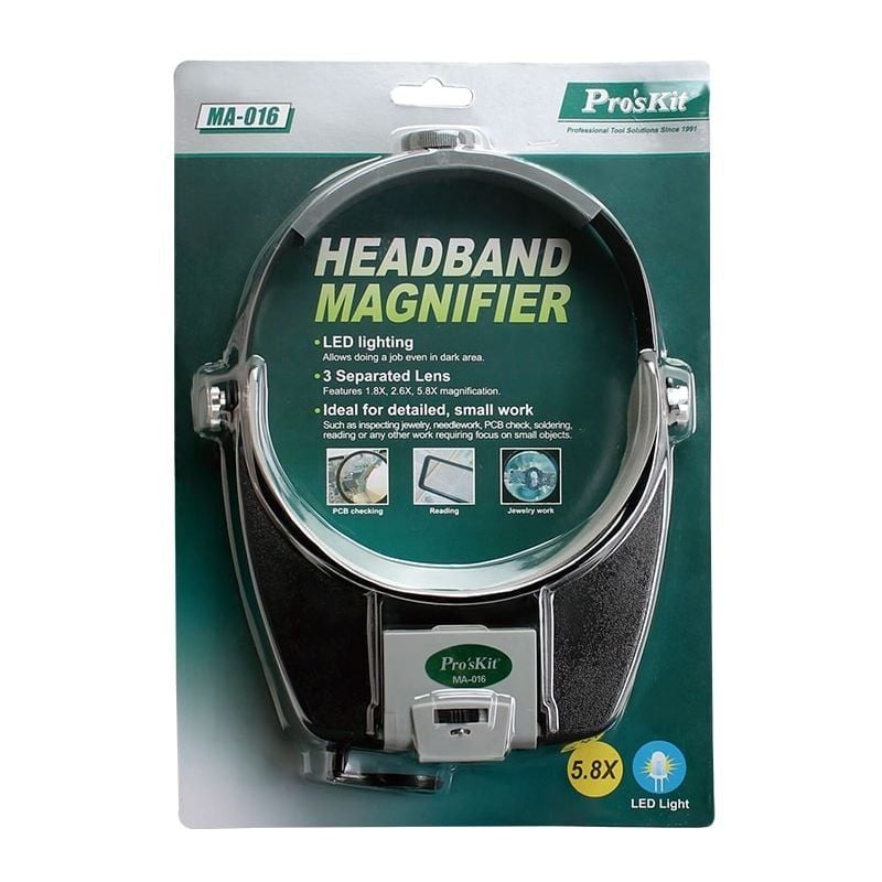Kính lúp đeo đầu Pro’sKit MA-016 được thiết kế để hỗ trợ quan sát và thao tác các chi tiết nhỏ mà mắt thường khó nhìn rõ — như linh kiện điện tử, mạch PCB, chi tiết cơ khí nhỏ, đồ thủ công, trang sức, v.v. MA-016 sử dụng hệ thống 3 ống kính có thể đổi kết hợp để đạt các mức phóng đại khác nhau — từ phóng đại nhẹ để quan sát rộng, đến phóng đại mạnh để nhìn chi tiết nhỏ.