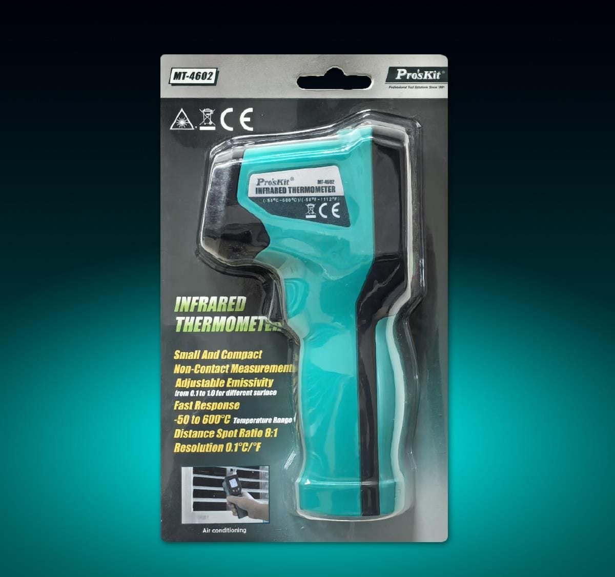 Máy đo nhiệt độ hồng ngoại Pro’sKit MT-4602 là thiết bị sử dụng công nghệ cảm biến hồng ngoại không tiếp xúc để đo nhiệt độ bề mặt vật thể một cách nhanh chóng, chính xác và an toàn. Thiết bị lý tưởng để sử dụng trong các ngành như bảo trì kỹ thuật, thực phẩm, điện lạnh, cơ khí, và môi trường khó tiếp cận hoặc nguy hiểm. Thiết kế gọn nhẹ, thao tác đơn giản, có tích hợp tia laser để định vị chính xác vùng đo.