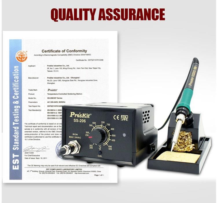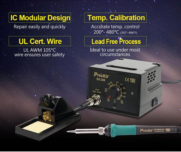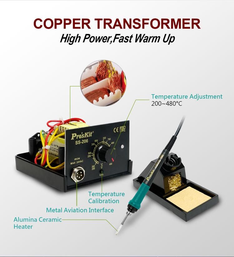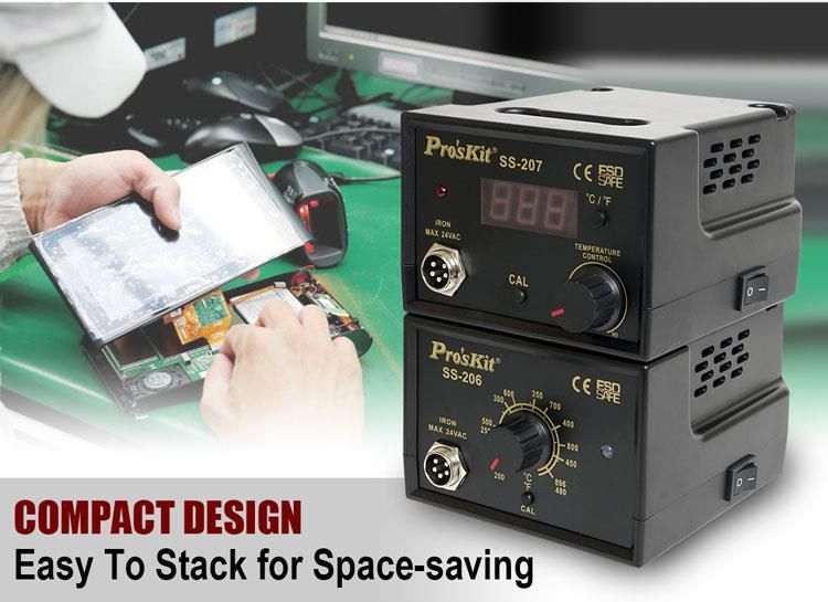 Máy hàn Pro'sKit SS-206B là trạm hàn điều khiển nhiệt độ bằng CPU, được thiết kế phù hợp cho các công việc hàn điện tử chính xác trong phòng thí nghiệm, nhà máy sản xuất hay sửa chữa thiết bị điện tử. Với thiết kế nhỏ gọn, tay cầm cách nhiệt tiện lợi, sản phẩm giúp người dùng thao tác lâu dài mà không mỏi tay. Hệ thống điều chỉnh nhiệt analog linh hoạt cùng bộ gia nhiệt gốm chất lượng cao giúp thiết bị đạt nhiệt độ nhanh và ổn định.