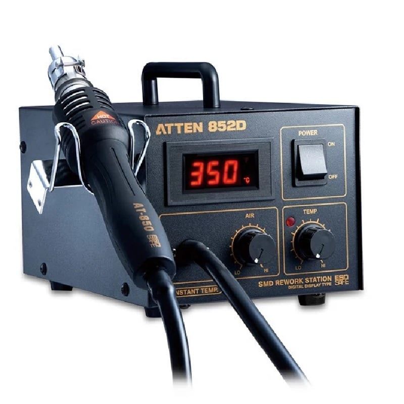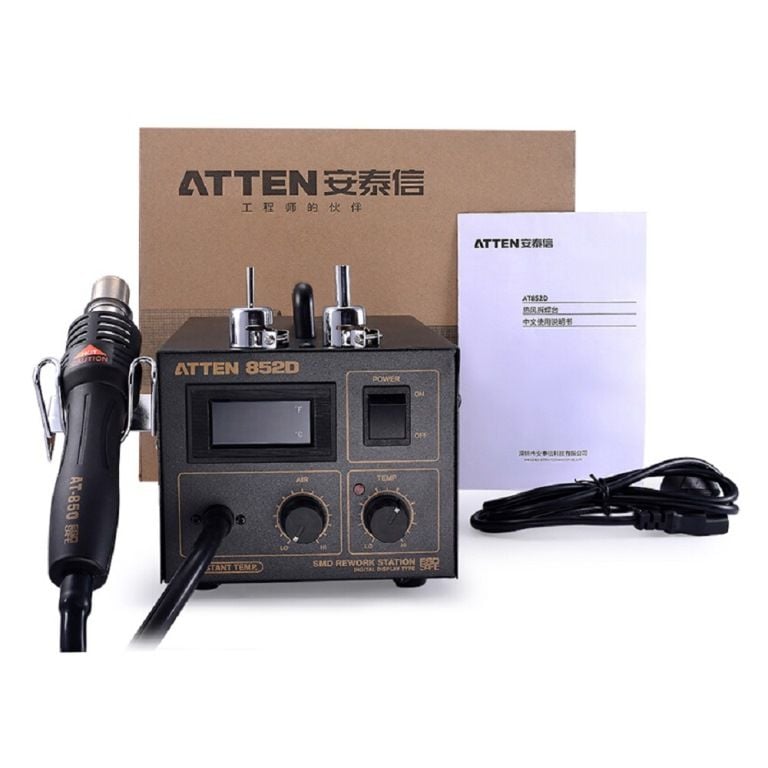 Máy AT-852D Hot Air Station từ thương hiệu Atten là thiết bị hỗ trợ hàn / tháo linh kiện SMD chuyên nghiệp, phù hợp cho nhiều môi trường từ sản xuất, R&D đến sửa chữa kỹ thuật. Thiết kế hiện đại tích hợp điều khiển vòng kín (closed-loop) và MCU zero-crossing, giúp tăng tốc độ làm nóng và giữ nhiệt ổn định. Điều chỉnh nhiệt độ và lưu lượng khí dễ dàng qua núm vặn, hiển thị LED rõ ràng. Máy còn trang bị bơm màng công suất cao và bộ gia nhiệt có bằng sáng chế, cho khả năng làm nóng nhanh, bền bỉ và tăng tuổi thọ sản phẩm. Hệ thống làm mát thông minh giúp tiếp tục tản nhiệt sau khi tắt và ngắt nguồn khi nhiệt độ < 100 °C để bảo vệ tay cầm và lõi gia nhiệt.